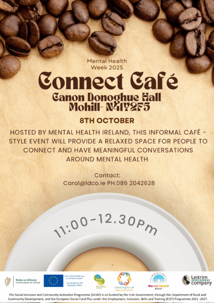 Connect Cafés will take place on Tuesday 7th of October at 11am in W8 Manorhamilton and Mohill Family Resourse Centre on 8th October at 11 am. The Connect Cafés will open up conversations in a relaxed space for meaningful conversations around mental health. Tea/Coffee and scones will be served.