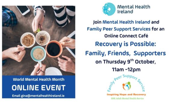 If you are interested in Family Recovery, join in for a short conversation on October 9th, 11am, Recovery is Possible: Family, Friends, Supporters, with Mental Health Ireland Development Officer Gina Delaney and the HSE Family Peer Support Worker covering Kilkenny, Carlow and South Tipperary, Belinda Coyle.